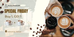 Setiap hari Jumat, kamu bisa mendapatkan promo Beli 1 Gratis 1 untuk semua menu kopi panas. Ajak temanmu dan rasakan kenikmatan kopi berkualitas dengan harga bersahabat